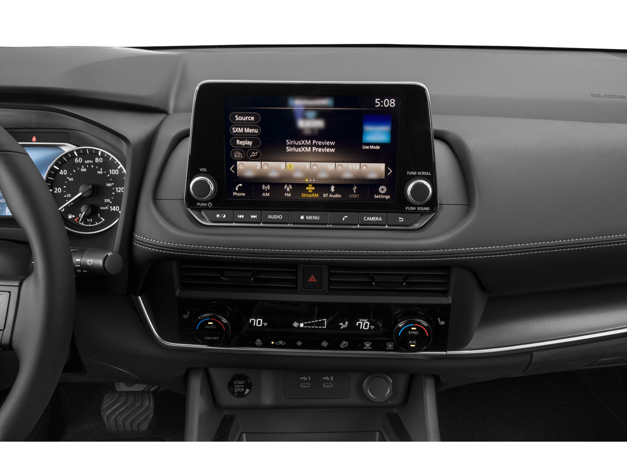 - Radio: AM/FM NissanConnect -inc: 6 speakers plus 2 tweeters, Apple CarPlay, Android Auto, 8" color touch screen display, Bluetooth®, 2 front USB type-C, Wi-Fi hotspot and NissanConnect Services powered by SiriusXM